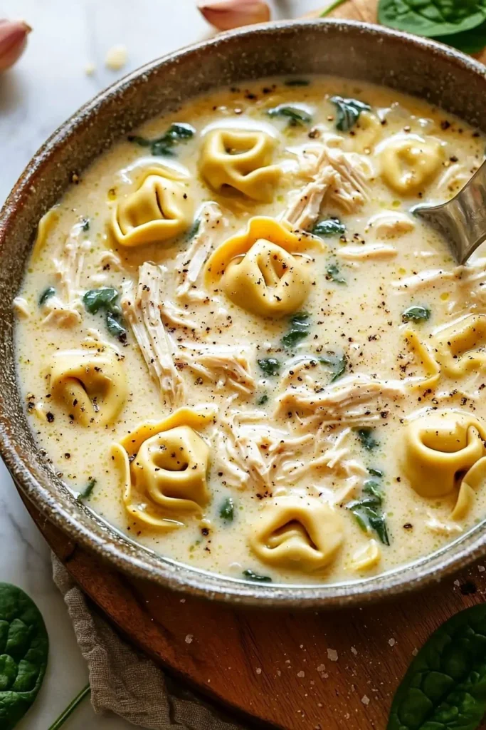 A warm and comforting soup made with tender chicken, cheese-filled tortellini, and a luscious creamy broth, perfect for chilly evenings.