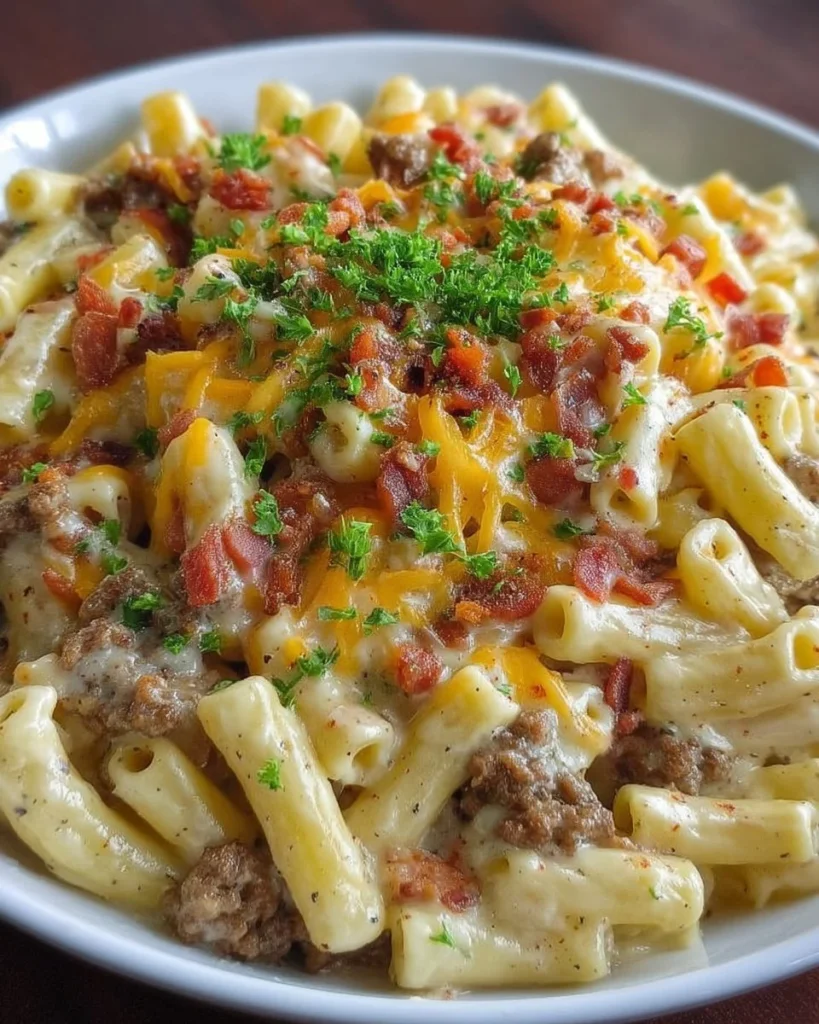 Indulge in the delightful flavors of Loaded Cheeseburger Alfredo Pasta that will bring family and friends together at mealtime. Enjoy every delicious bite of this beautiful dish!