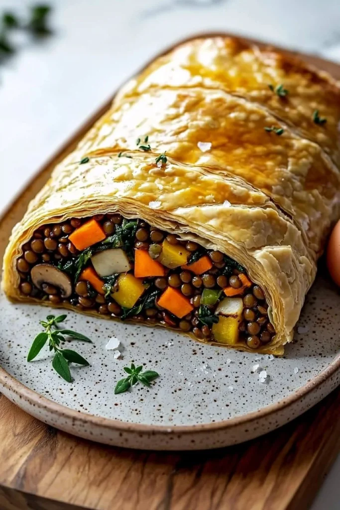 - Assemble the Wellington: On a lightly floured surface, roll out the puff pastry. Lay the cooled vegetable-lentil mixture in the center. Fold the pastry over the filling, ensuring a snug fit. Pinch the edges to seal and create a decorative shape, if desired.